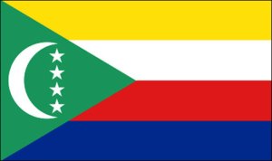 Comoros is officially referred to as the Union of Comoros and consists of four main islands: Grande Comore, Mohéli, Anjouan, and Mayotte. The archipelago is located off the eastern coast of Africa in the Indian Ocean between Mozambique and Madagascar. Each of the stripes on the flag represents the main color of the flag for one of these islands. The blue stands for the flag of Grande Comore, the red for the flag of Anjoun, and yellow for the flag of Mohéli. The white stands for Mayotte, which is actually administered by France.